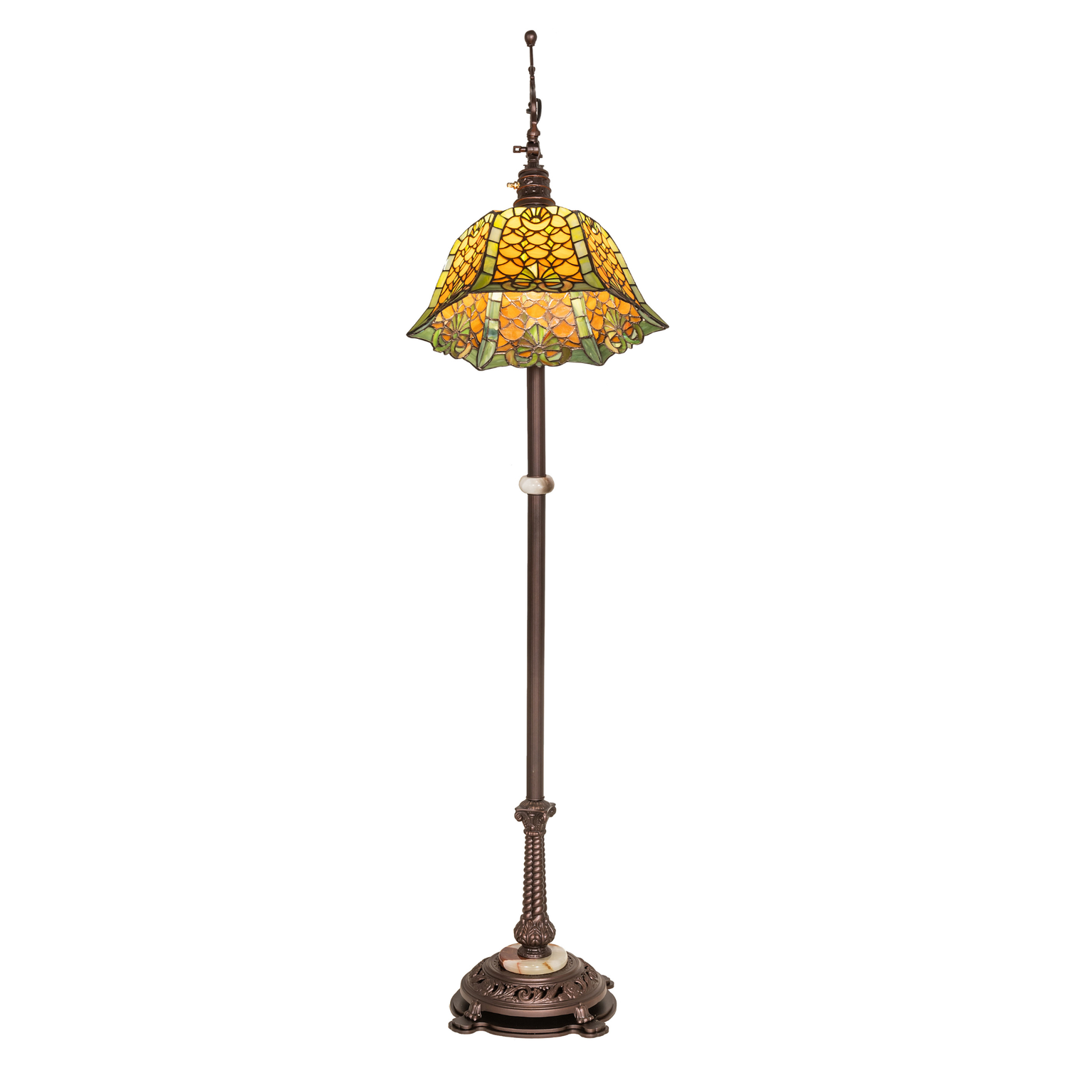 The Tiffany-Style Duffner & Kimberly Shell & Diamond Bridge Arm Floor Lamp, 69” High, showcases the artistry and sophistication of early 20th-century design. Its handcrafted stained glass shade glows in rich honey amber tones, complemented by an intricate jade glass pattern inspired by European architecture. The elegant bridge arm and base, finished in warm mahogany bronze and accented with marble, add a touch of luxury and refinement. Perfect for traditional or vintage-inspired interiors, this lamp combines historical elegance with timeless craftsmanship for a truly captivating statement piece.