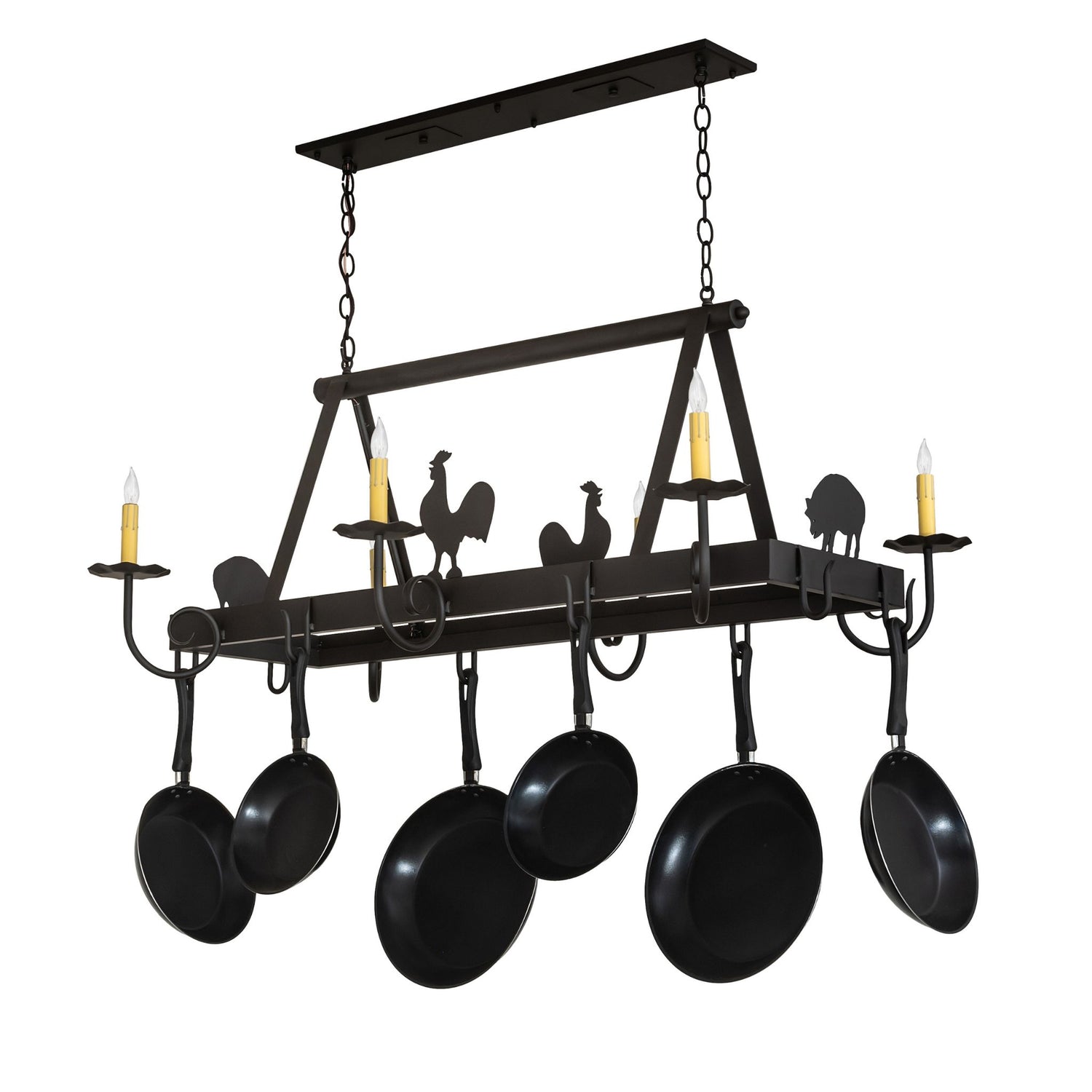 Bring farmhouse warmth to your kitchen with the Barn Animals 6-light pot rack chandelier, 46" long. Featuring charming pig and rooster silhouettes, this handcrafted fixture blends rustic artistry with functional design. Six faux candlelights with scrolled arms cast a welcoming glow, while integrated hooks provide elegant cookware display. Finished in rich oil-rubbed bronze, it makes a bold yet refined centerpiece above a kitchen island or dining space. Adjustable in height from 21 to 32 inches, this American-made chandelier is built for lasting beauty and utility.