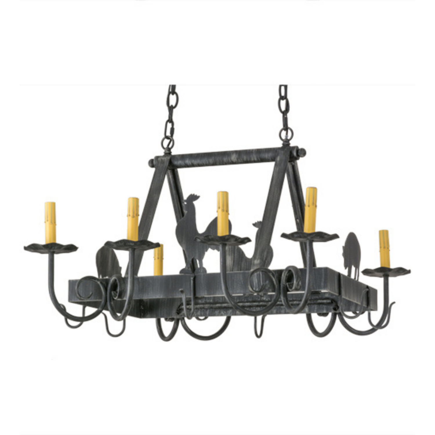 The Barn Animals 8-light pot rack chandelier, 27" long, brings whimsical farmhouse charm and elegant detail to your kitchen. Pig and rooster silhouettes adorn the antique iron gate frame, while eight ivory faux candlelights are crowned with Tuscan alabaster Textrene shades for a warm, refined glow. Scrolled arms and bobeches enhance its rustic elegance, while integrated hooks provide a practical way to display cookware. Adjustable in height from 25 to 60 inches, this American-made fixture blends artistry and utility, making it a perfect centerpiece for farmhouse, rustic, or country-style interiors.