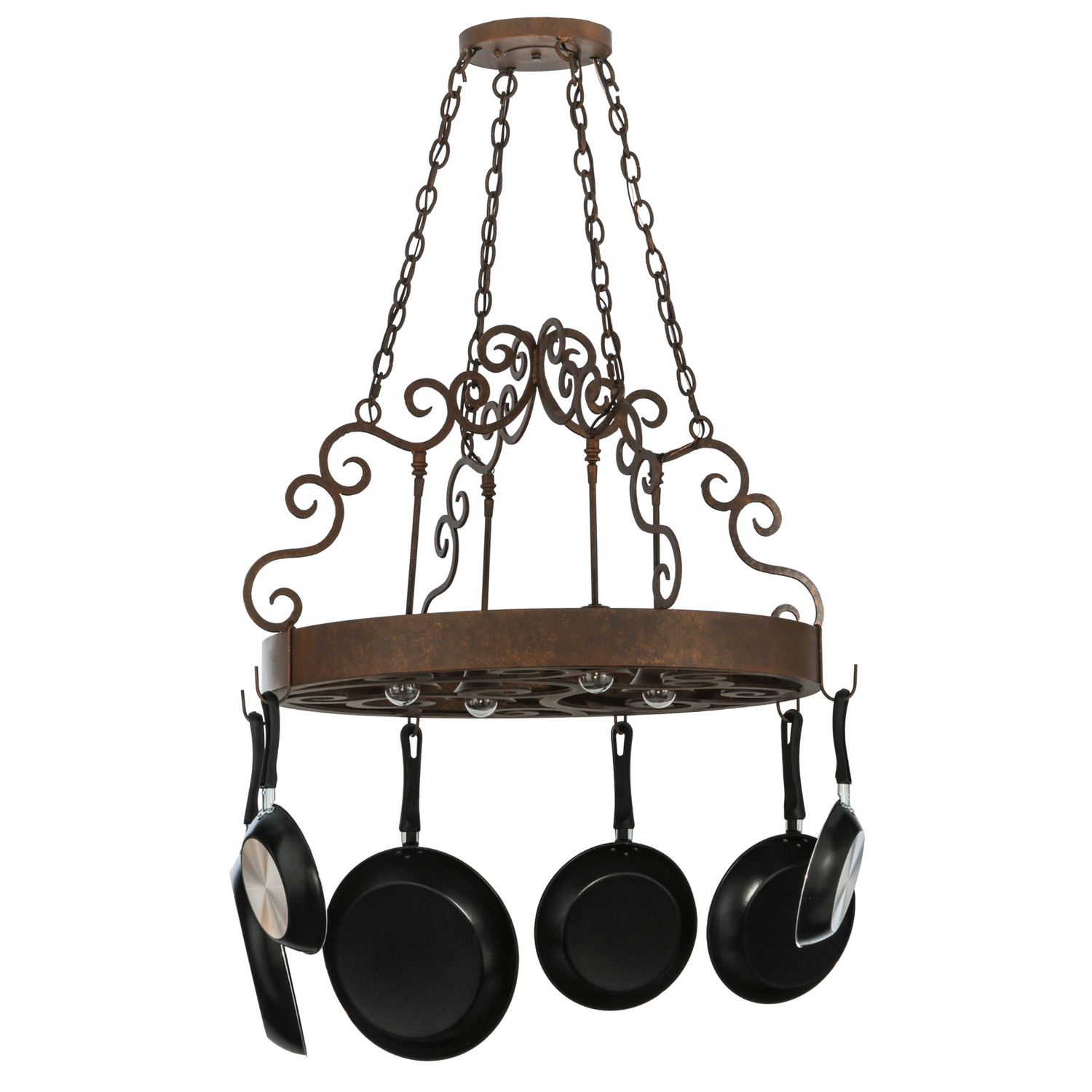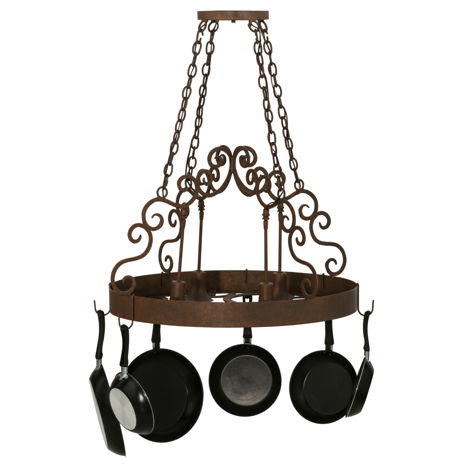 Dior 4-Light Round Pot Rack Chandelier with Scroll Accents in Antique Rust, 34" Wide