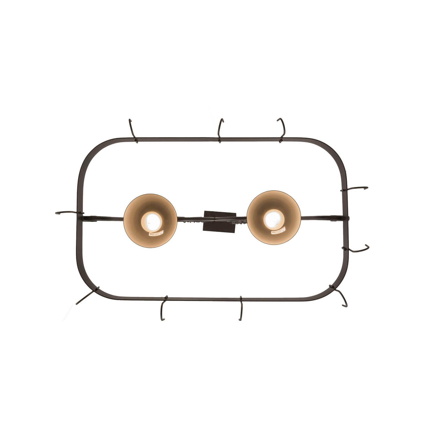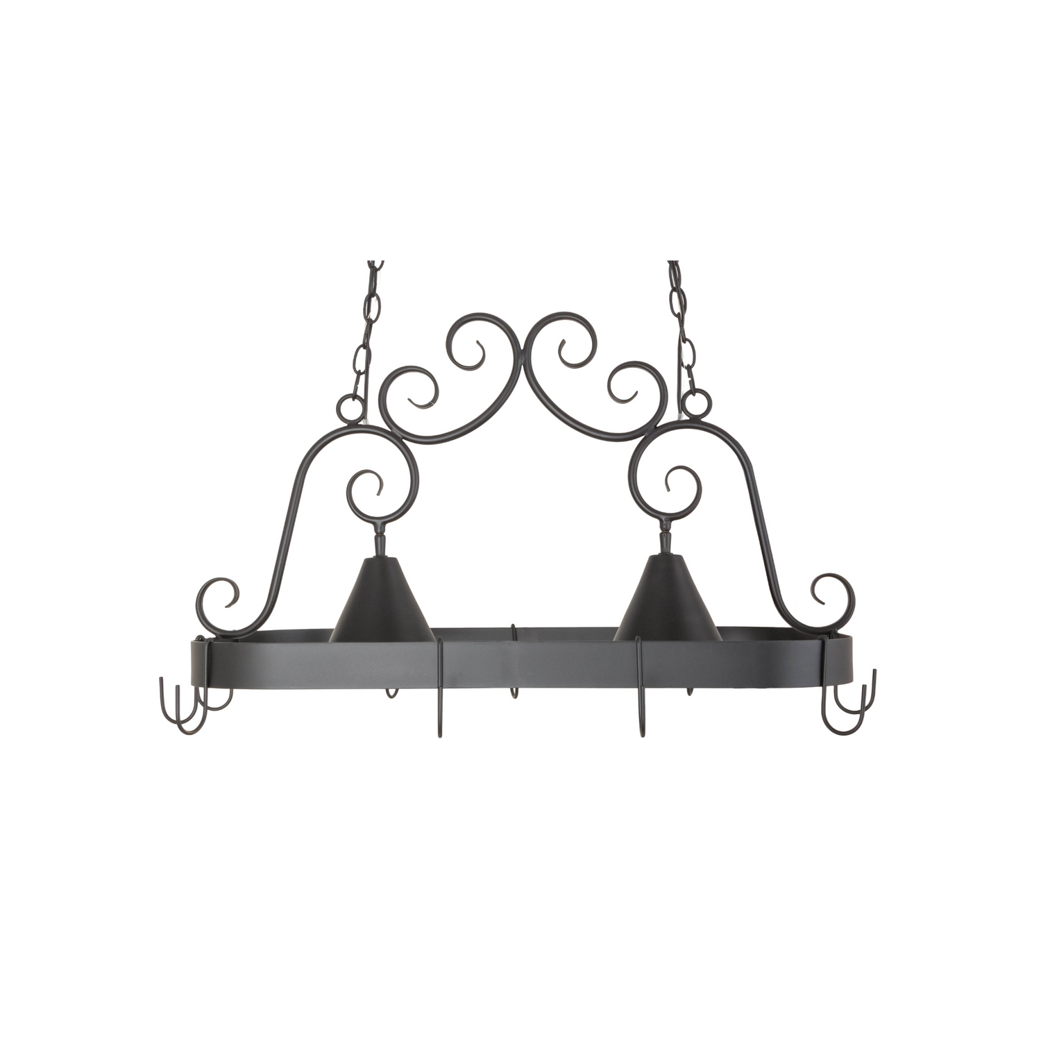 The Elana 2-light pot rack chandelier, 32" long, blends upscale design with practical function. Its hand-forged iron scroll accents and blackwash finish add timeless elegance, while two luminaires provide bright downlighting for counters, islands, and dining spaces. Integrated hooks allow for convenient cookware display, combining beauty with everyday utility. Adjustable in height from 21.5 to 46.5 inches, this American-made fixture adapts easily to a range of kitchen settings. A refined centerpiece, Elana is both decorative and functional.