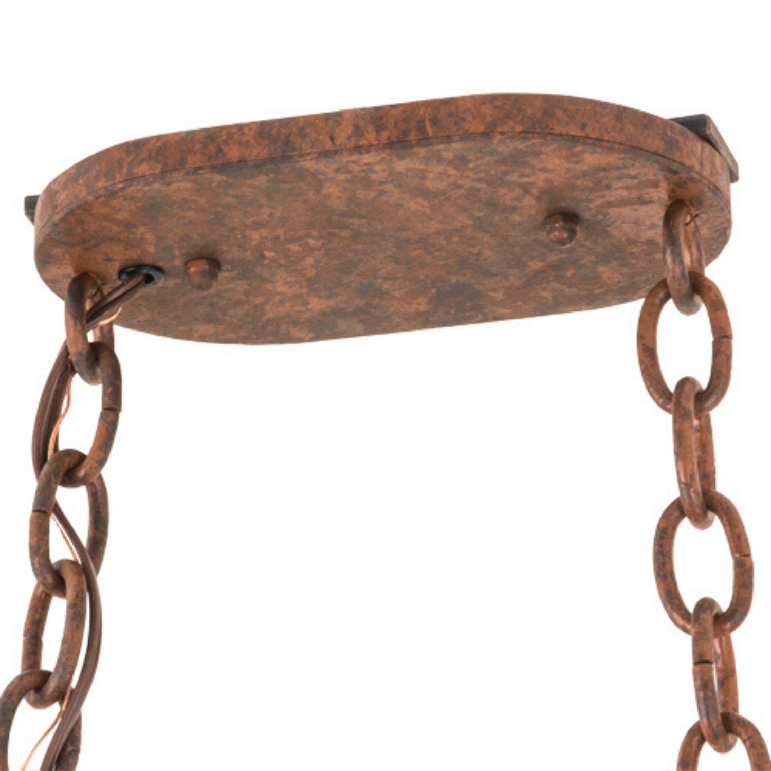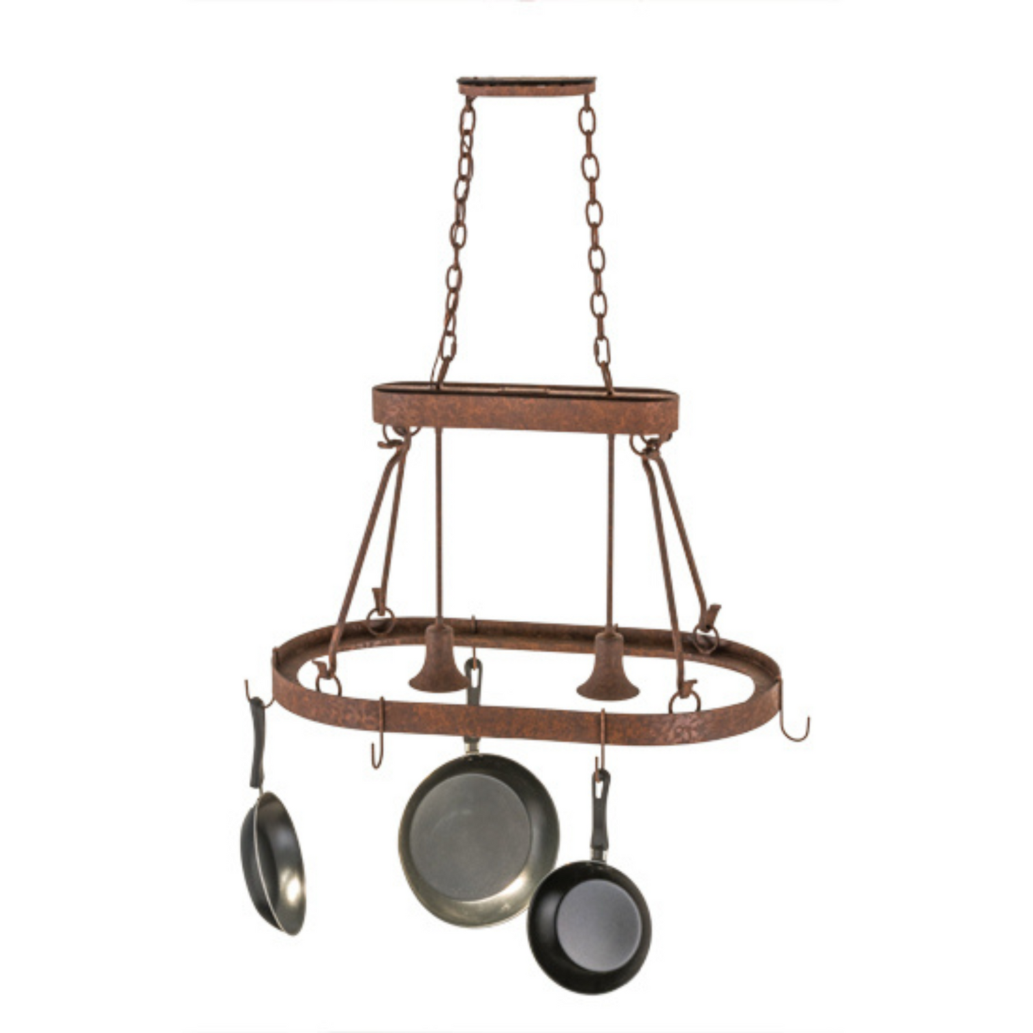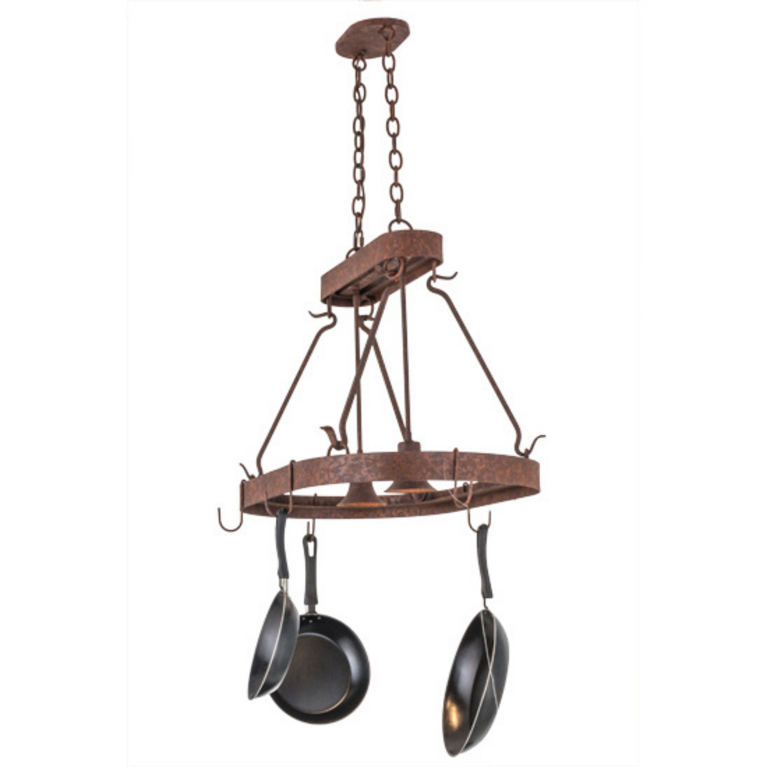 The Harmony 2-light pot rack chandelier, 32" long, marries rustic charm with functional elegance. Handcrafted with scrollwork in a warm rusty nail finish, it features two medium-base downlights that provide focused illumination over counters, islands, or dining areas. Integrated hooks make cookware storage stylish and practical. Adjustable in height from 24.5 to 58 inches, this American-made fixture adapts easily to kitchens of all sizes. A versatile design that balances artistry with utility, Harmony adds character to any culinary space.