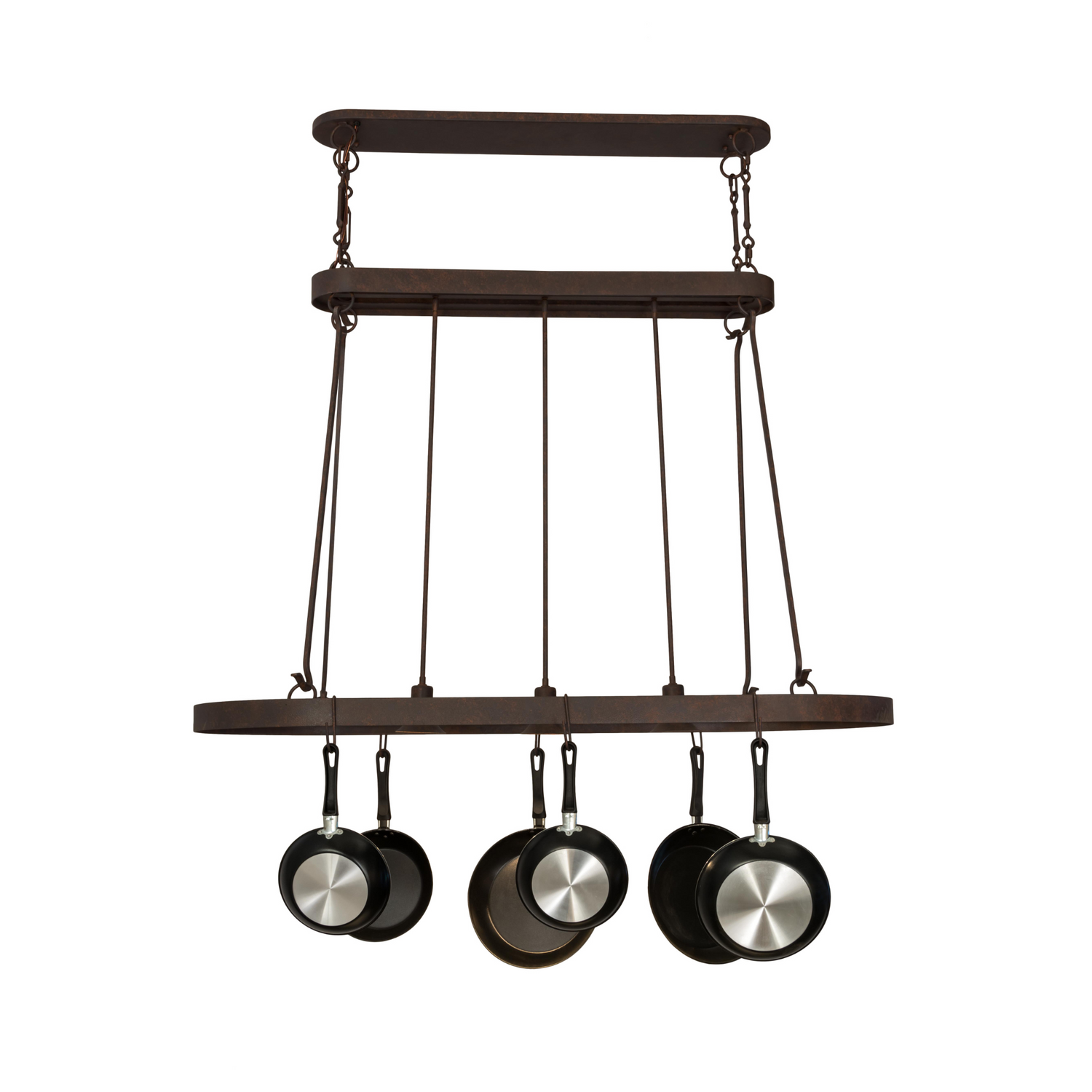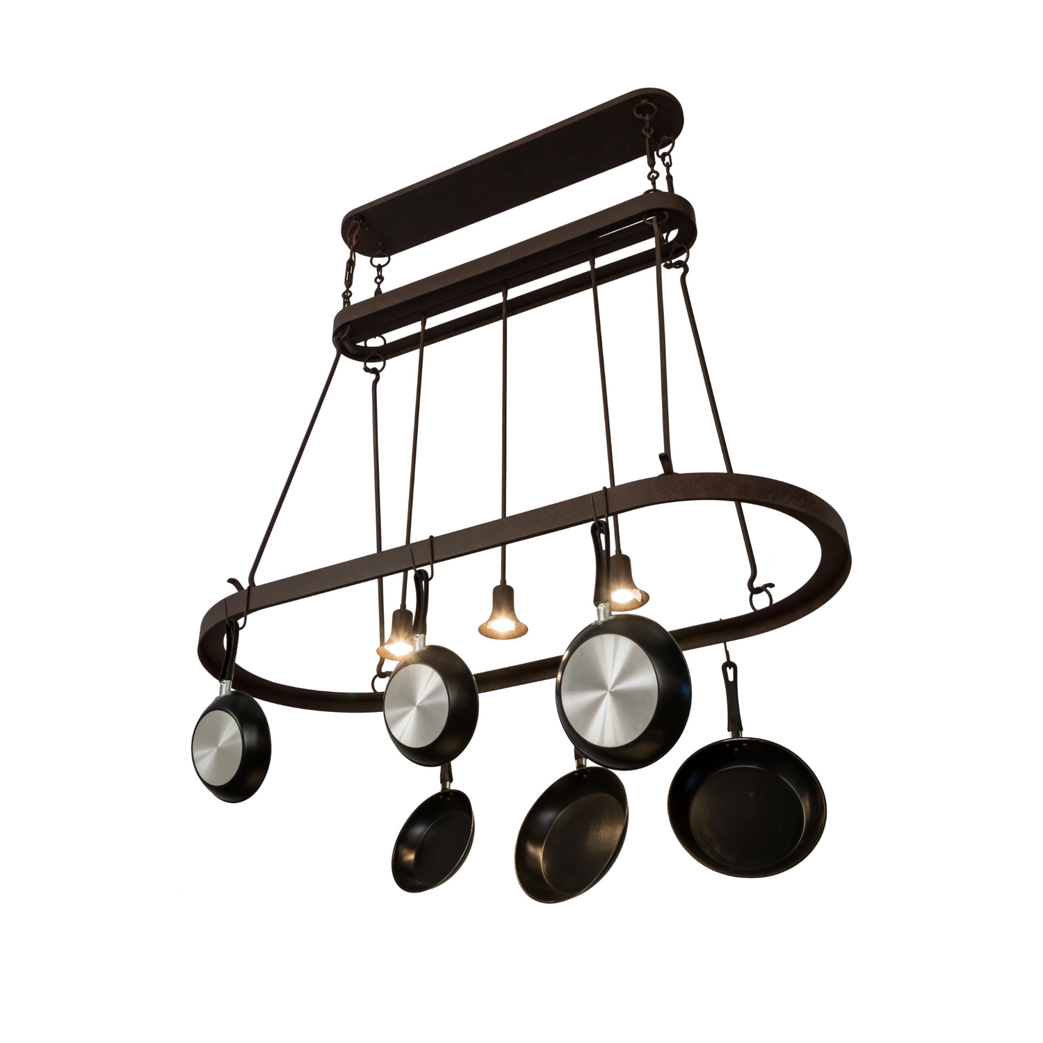 The Harmony 3-light pot rack chandelier, 55" long, marries rustic charm with functional elegance. Hand-forged iron scrollwork in a rustic rusty nail finish frames its oval design, while three medium-base downlights provide practical illumination for counters and islands. Integrated hooks allow cookware and accessories to be displayed within reach, blending utility with style. Adjustable in height from 50 to 110 inches, this American-made fixture is versatile for residential or hospitality settings. Combining artistry with everyday function, Harmony makes a bold kitchen centerpiece.