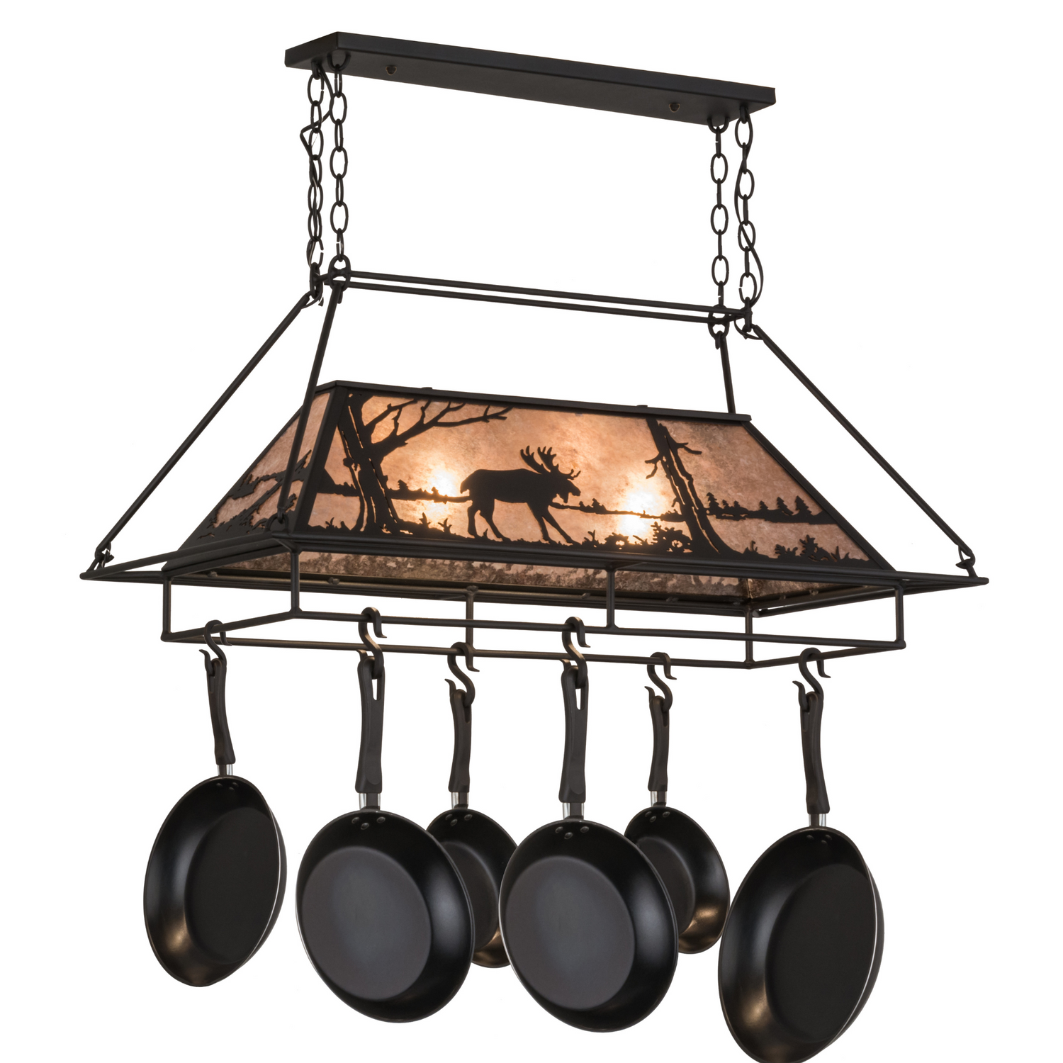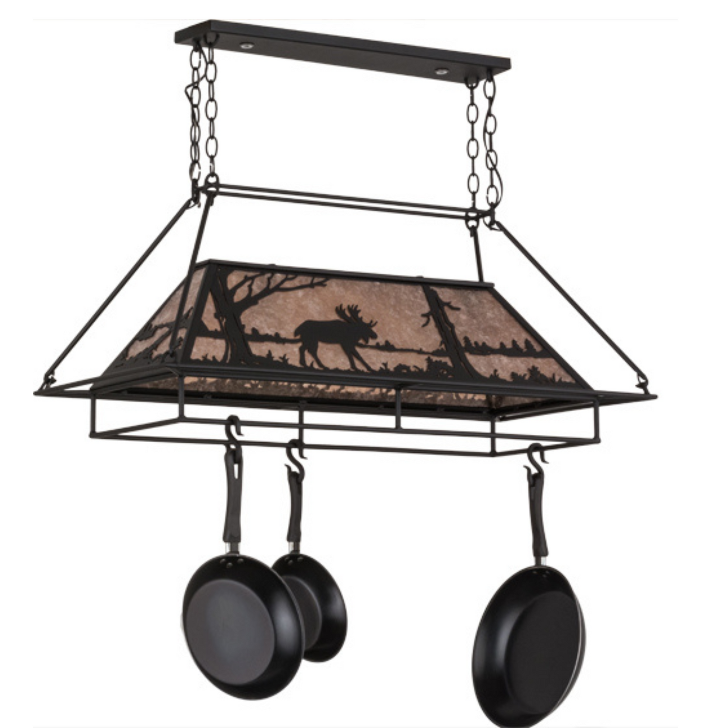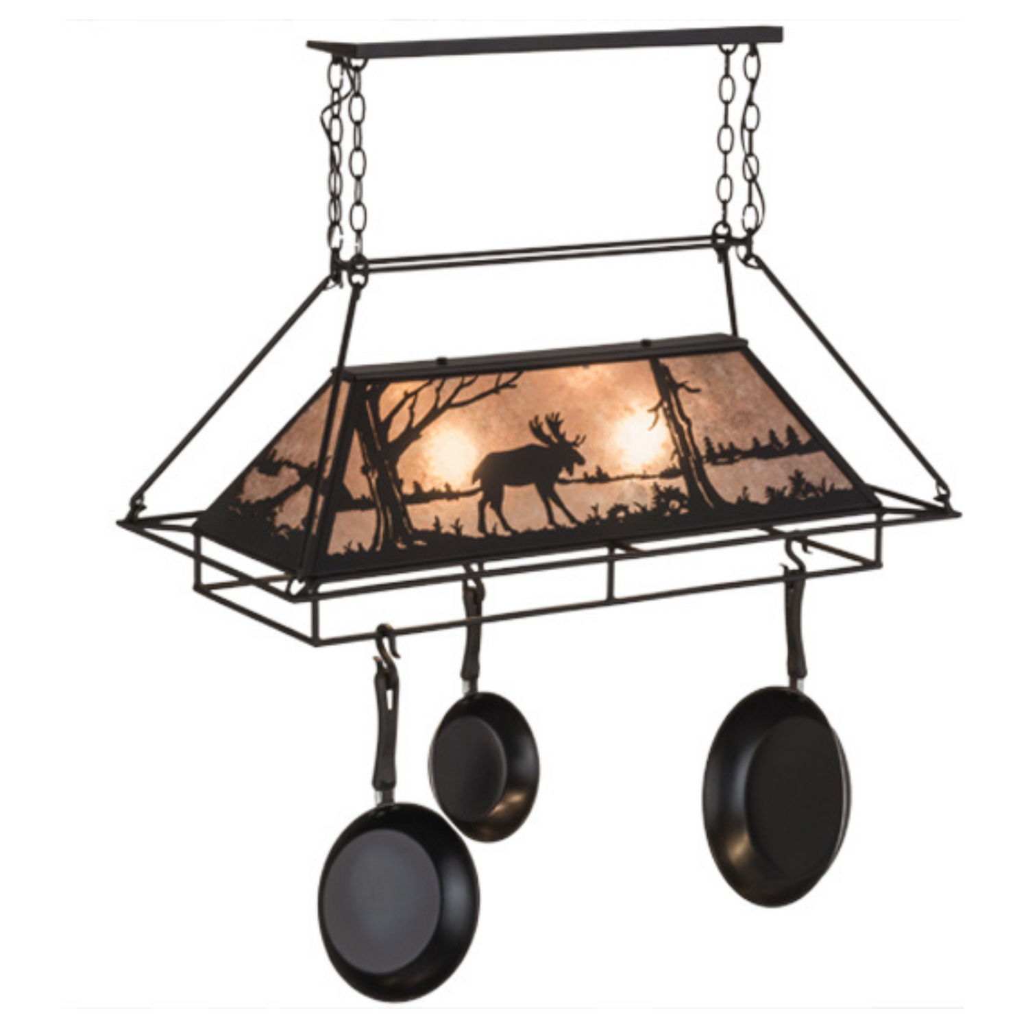 The Moose at Lake pot rack light, 40" long, captures rustic charm with moose and pine tree silhouettes glowing against a Silver Mica diffuser. Finished in textured black, this handcrafted fixture offers both decorative beauty and practical function. Integrated hooks provide space to suspend cookware, while its adjustable chain makes it versatile for any ceiling height. Made in the USA, this piece is fully customizable in size, finish, and lamping options, including energy-efficient LEDs. A striking centerpiece, it brings wilderness-inspired artistry to your kitchen.