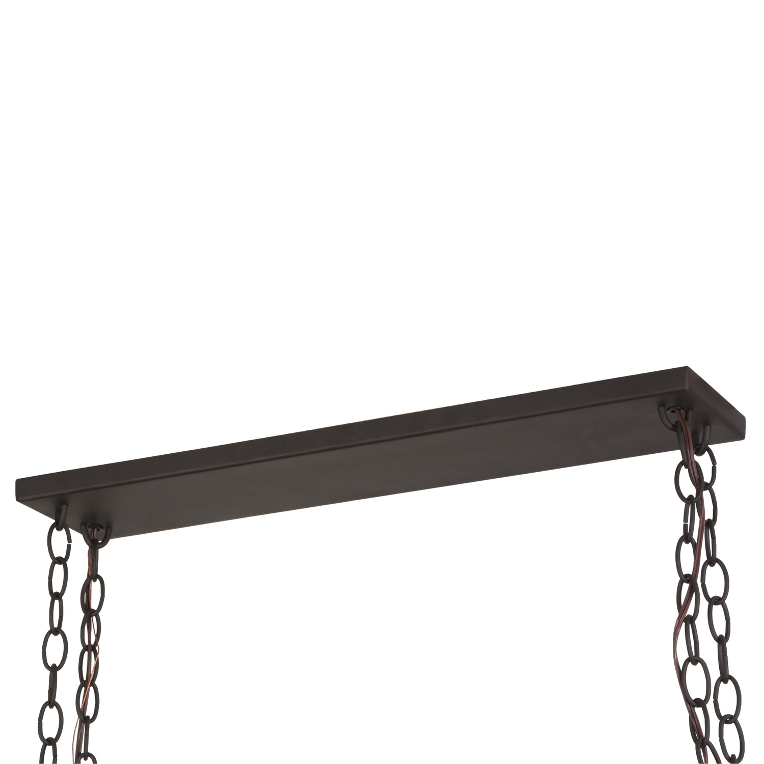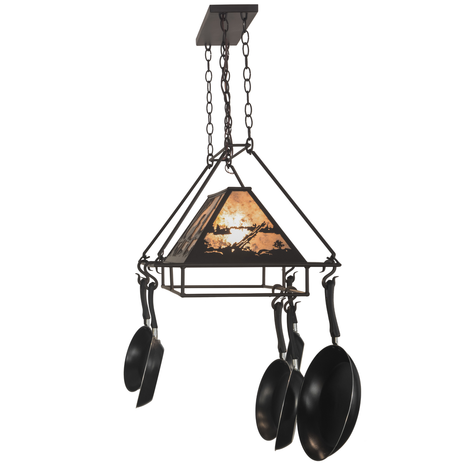 The Moose at Lake lighted pot rack chandelier, 39" long, captures the rustic spirit of the Adirondacks. A majestic moose is depicted wandering near a woodland lake, framed in oil rubbed bronze with a warm silver mica diffuser for ambient glow. Integrated hooks provide a practical and decorative way to display cookware, blending artistry with function. Adjustable in height from 20 to 31 inches, this American-made fixture is ideal for cabins, lodges, or rustic homes. A statement piece that celebrates nature’s beauty while enhancing culinary spaces.