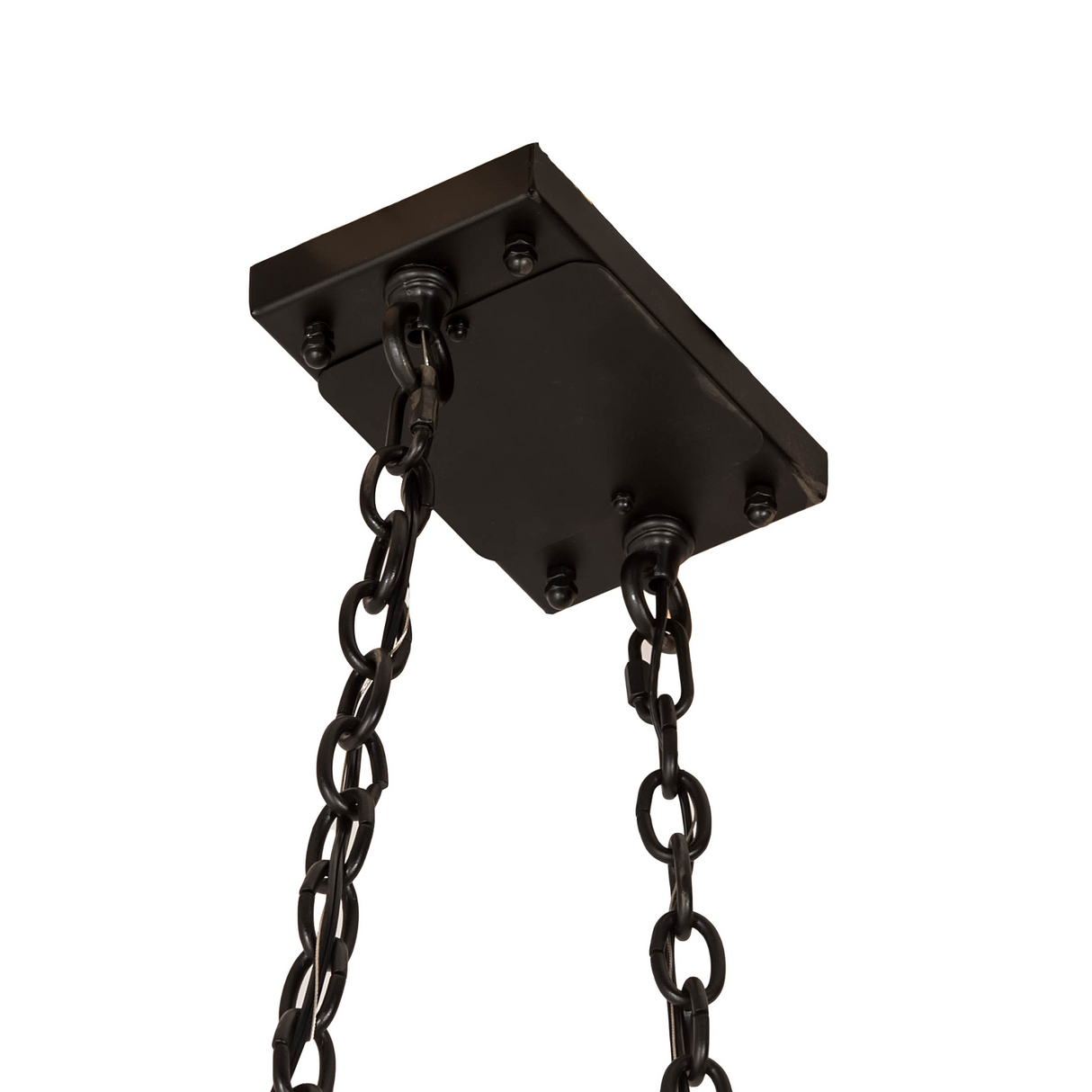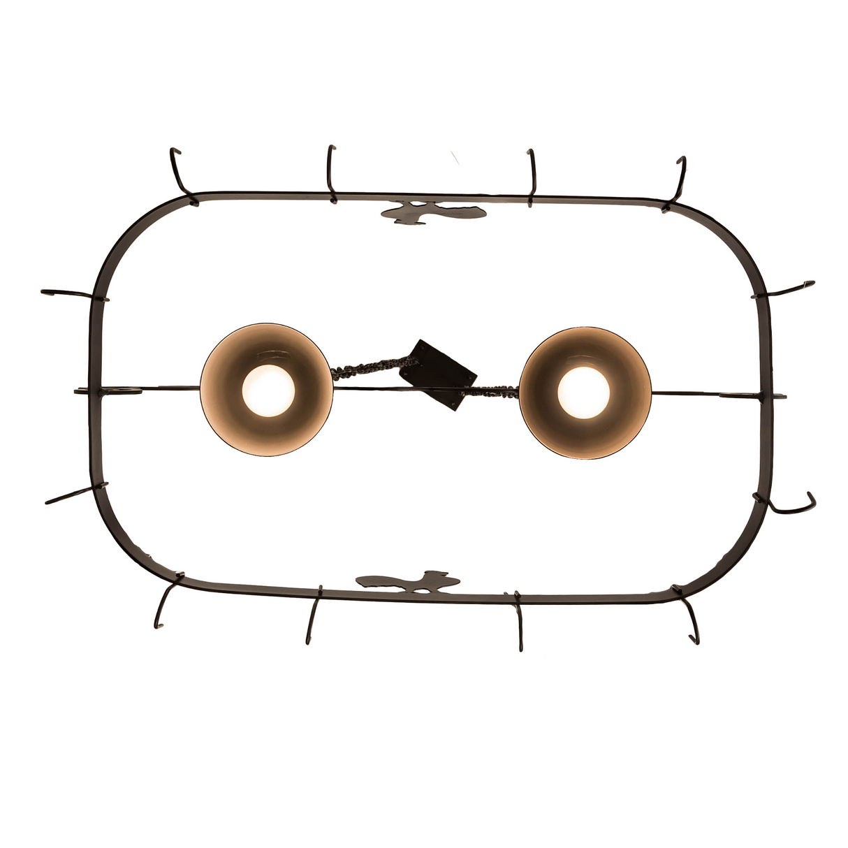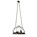 The Poulet 2-light pot rack chandelier, 32" long, combines rustic charm with practical functionality. Its hand-forged scroll accents and blackwash finish bring timeless elegance to kitchens and dining spaces. Two downlights provide focused illumination for counters and islands, while integrated hooks offer convenient cookware display. Adjustable in height from 32 to 94 inches, this American-made fixture is both versatile and durable. With its balance of style and function, Poulet is an ideal centerpiece for refined culinary interiors.