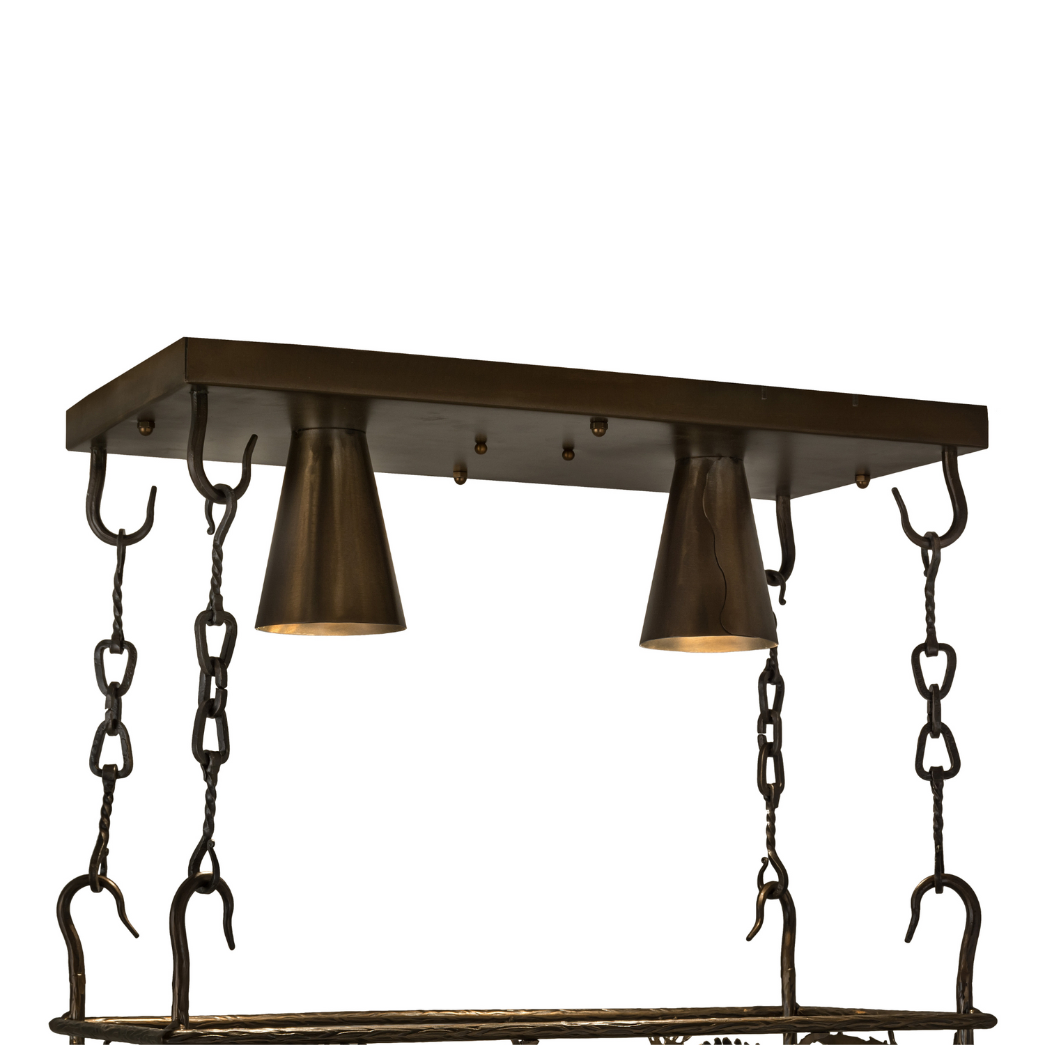 The Whispering Pines 2-light pot rack chandelier, 24" long, brings nature-inspired beauty and rustic elegance to your kitchen. Adorned with pinecones and needles, the antique copper frame supports two luminaires that provide warm, functional illumination. Integrated hooks allow for stylish cookware display, blending artistry with utility. Compact in size yet rich in detail, this American-made fixture is perfect for cozy kitchens or lodge-style interiors. A handcrafted design that celebrates the outdoors while enhancing culinary spaces.